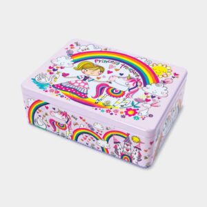 This themed storage tin is double walled and hinged. It features bright and fun princess and unicorn characters and makes a perfect gift for children.